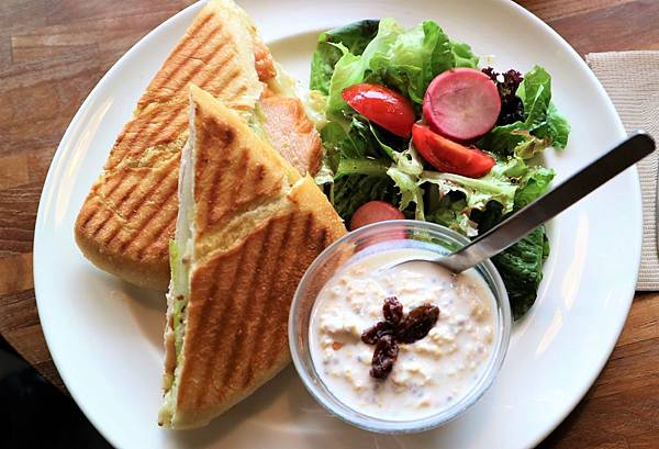 - Mr.C:拿鐵+蜂蜜芥末籽燻雞,麵包烤得蠻酥脆的,搭配瑞士冷燕麥、生菜沙拉佐油醋醬,整體算是清淡路線!